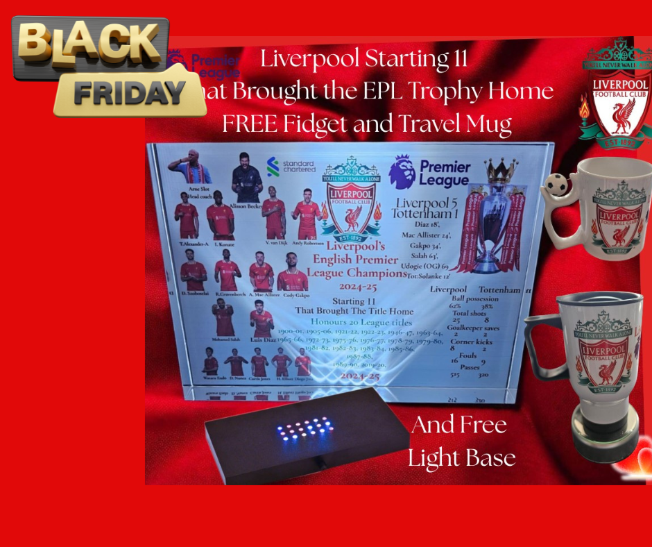 Celebrate Black Friday Day with our Liverpool EPL Special deal. Made from pure crystal, this unique set includes the starting 11 players and their stats, as well as the years of hall of honours wins. Plus, you'll receive a free Fidget Spinner cup, travel mug, and extra-large light. All packaged in a gift box. Limited stock available.