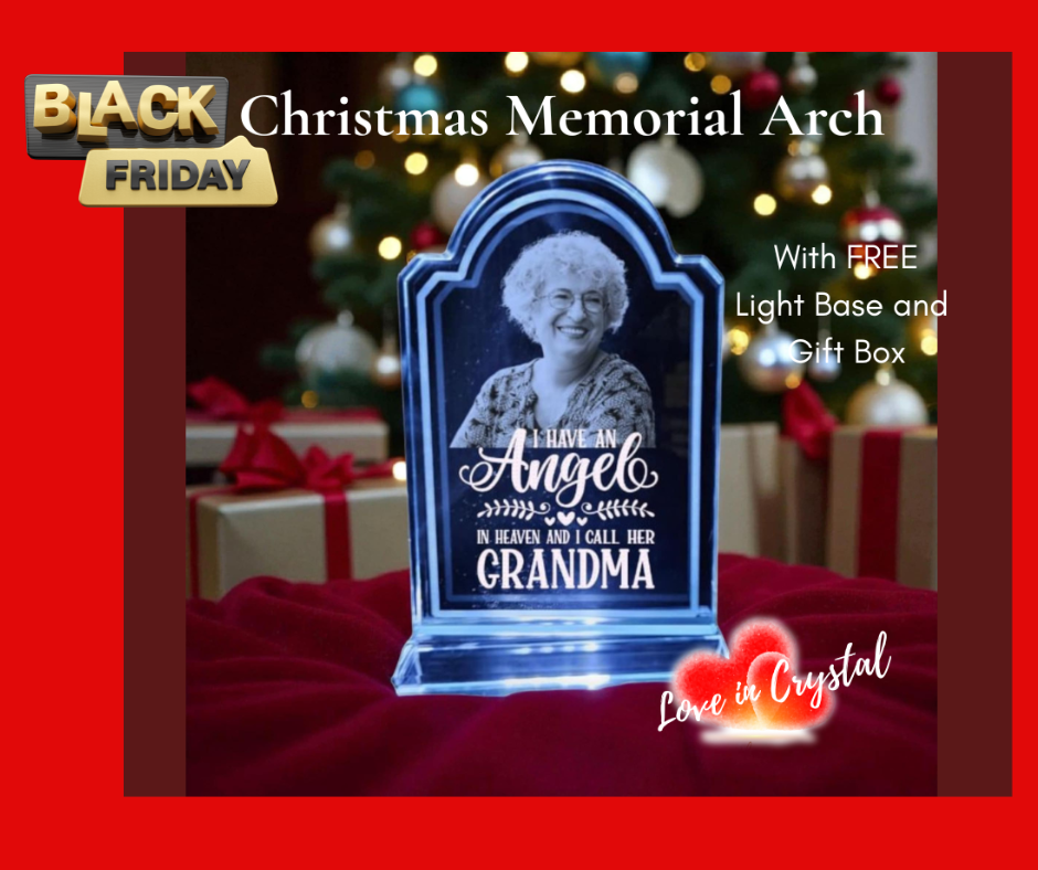The Memorial Crystal Arch is a refined keepsake featuring personalized engraving of a photo and message, offering a lasting tribute to a cherished memory. Presented on an illuminated base, the arch highlights intricate details with a subtle glow, enhancing its visual impact. Delivered in a gift box, it is thoughtfully packaged for presentation or safekeeping, making it a meaningful and elegant remembrance piece.